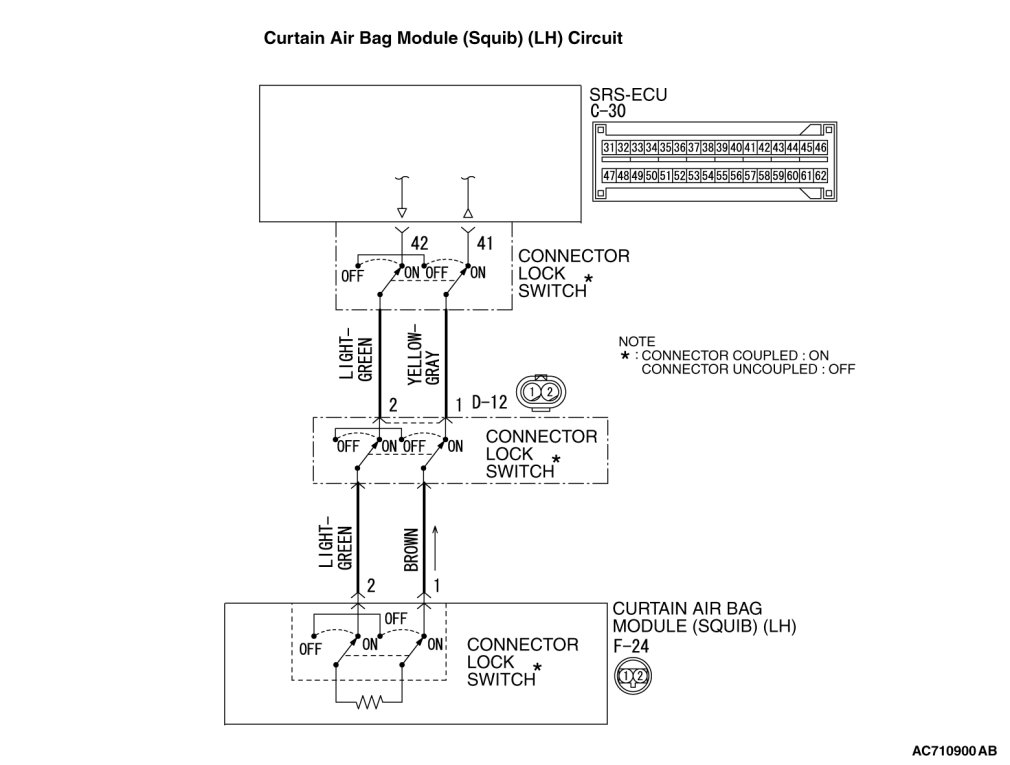 To prevent the air bag from deploying unintentionally, disconnect the curtain air bag module connector F-24 to short the squib circuit.