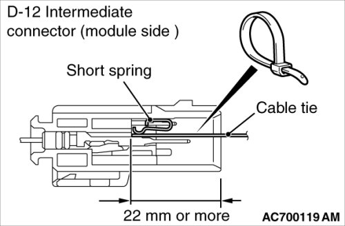 (4)Because the short spring is installed to the D-12 intermediate connector (curtain air bag harness side), insert a cable tie [3 mm (0.12 inch) wide, 0.5 mm (0.02 inch) thick] between terminals 1, 2 and the short spring to release the short spring.