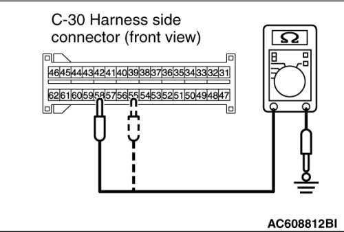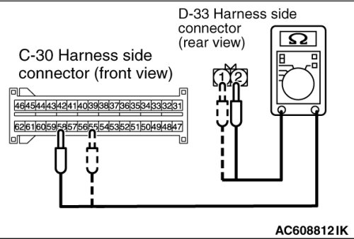 - SRS-ECU connector C-30 (terminal No.58) and the seat belt buckle switch (passenger's side) connector D-33 (terminal No.2)