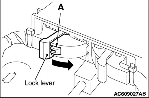(2)While pushing the part "A" indicated in the figure of the harness side connector, turn the lock lever to the direction of the arrow to release the lock lever, and disconnect the C-30 SRS-ECU connector.