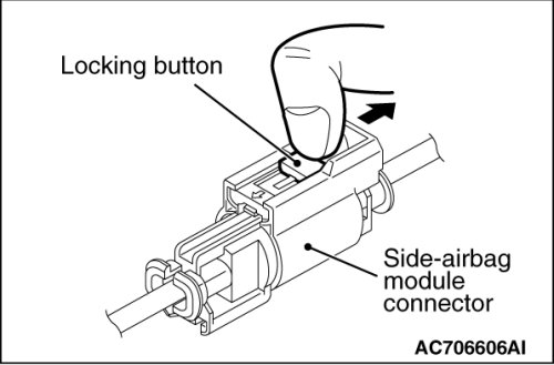 Disconnect the D-32 side-airbag module connector, unlock the connector by sliding the locking button to the direction of the arrow as shown in the figure, and then disconnect the connector.