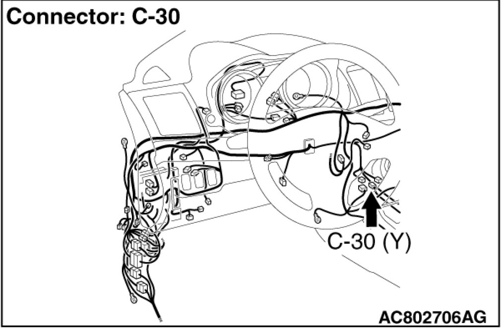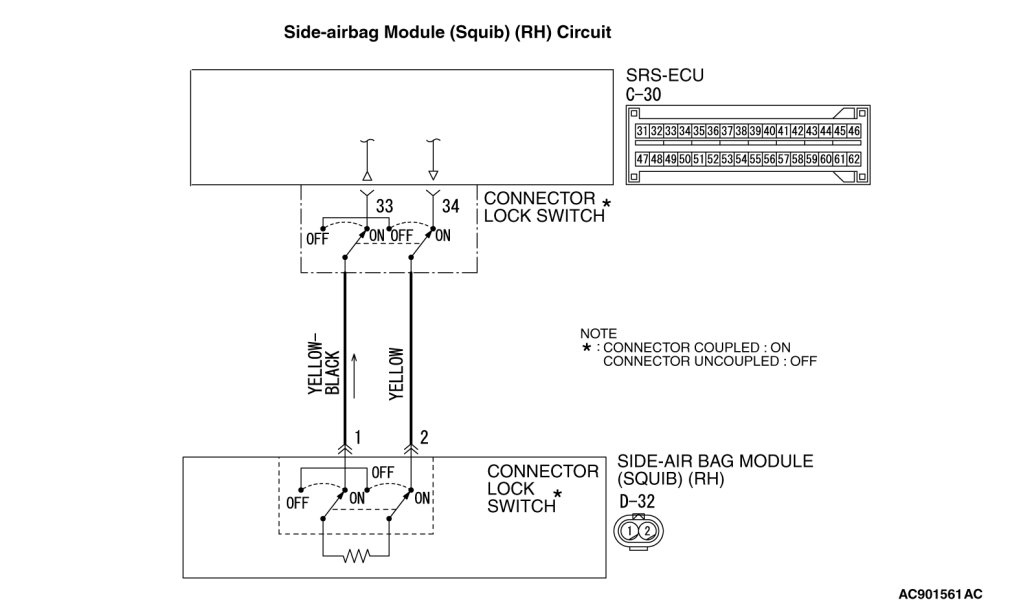 - SRS-ECU connector C-30 (terminal No.33) and the side-airbag module (RH) connector D-32 (terminal No.1)