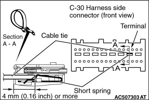 Insert a cable tie [3 mm (0.12 inch) wide, 0.5 mm (0.02 inch) thick] between terminals 33, 34 and the short spring to release the short spring.