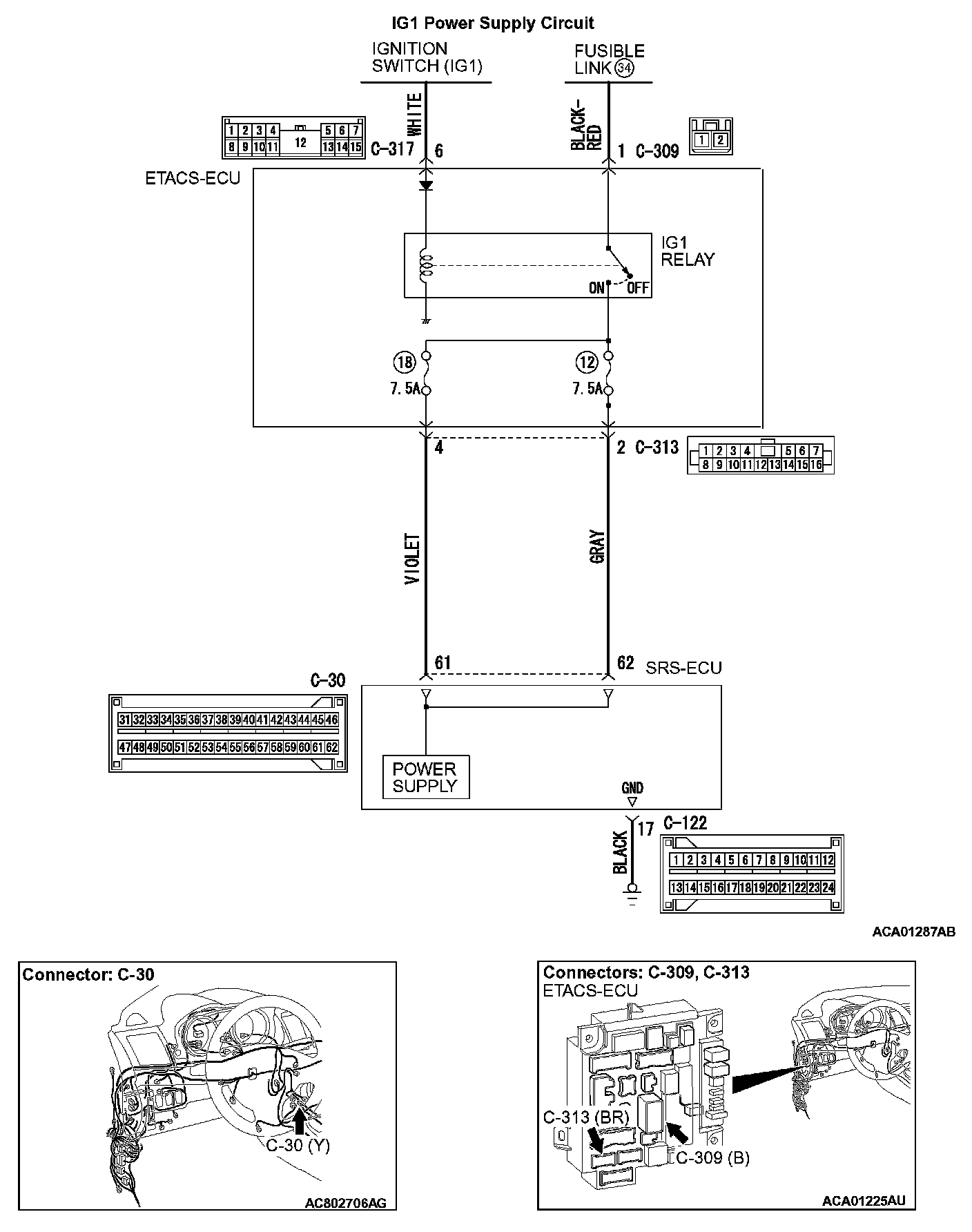 - SRS-ECU connector C-30 (terminal No.62) and the ETACS-ECU connector C-313 (terminal No.2)