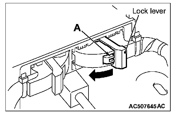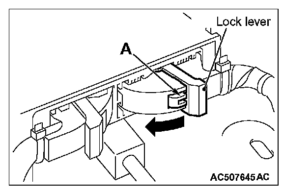 2. While pushing the part "A" indicated in the figure of the harness side connector, turn the lock lever to the direction of the arrow to release the lock lever, and disconnect the C-30 SRS-ECU connector.