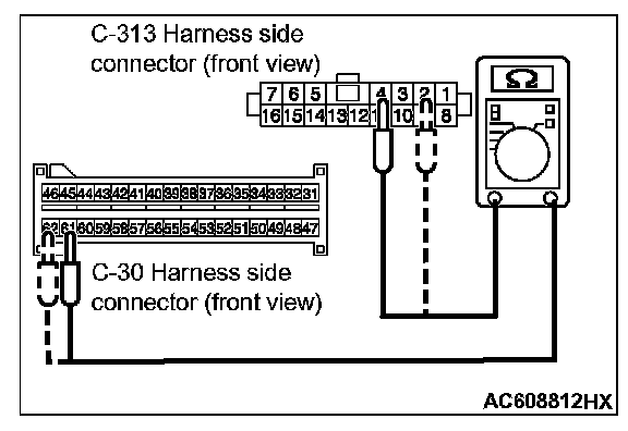 STEP 9. Check the harness for open circuit between SRS-ECU connector C-30 (terminal No.61 and 62) and the ETACS-ECU connector C-313 (terminal No.4 and 2).