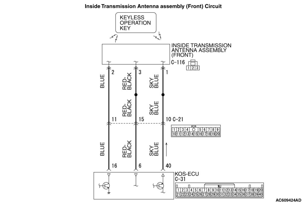 STEP 1. Check KOS-ECU connector C-31 and inside transmission antenna assembly (front) connector C-116 for loose, corroded or damaged terminals, or terminals pushed back in the connector.