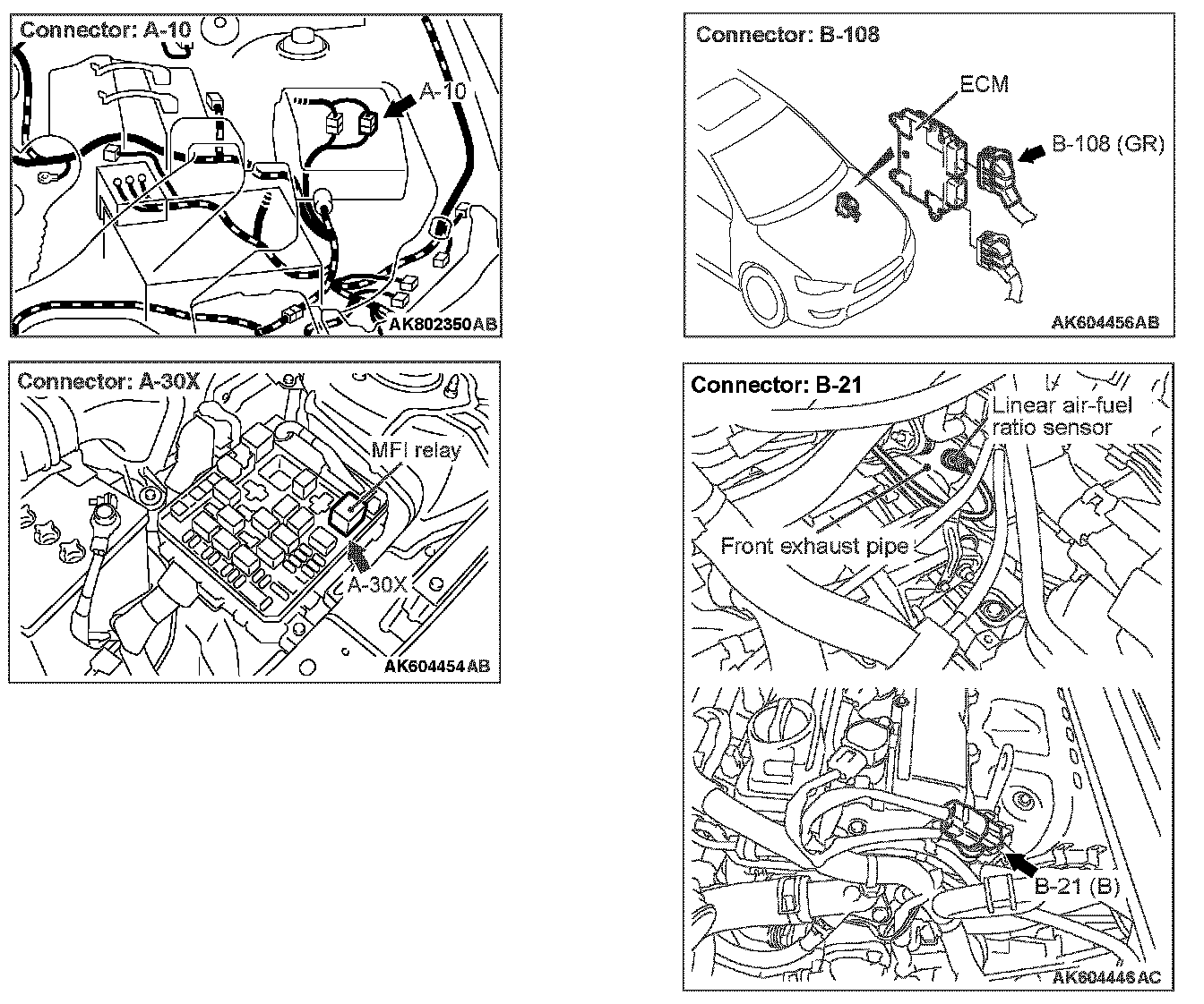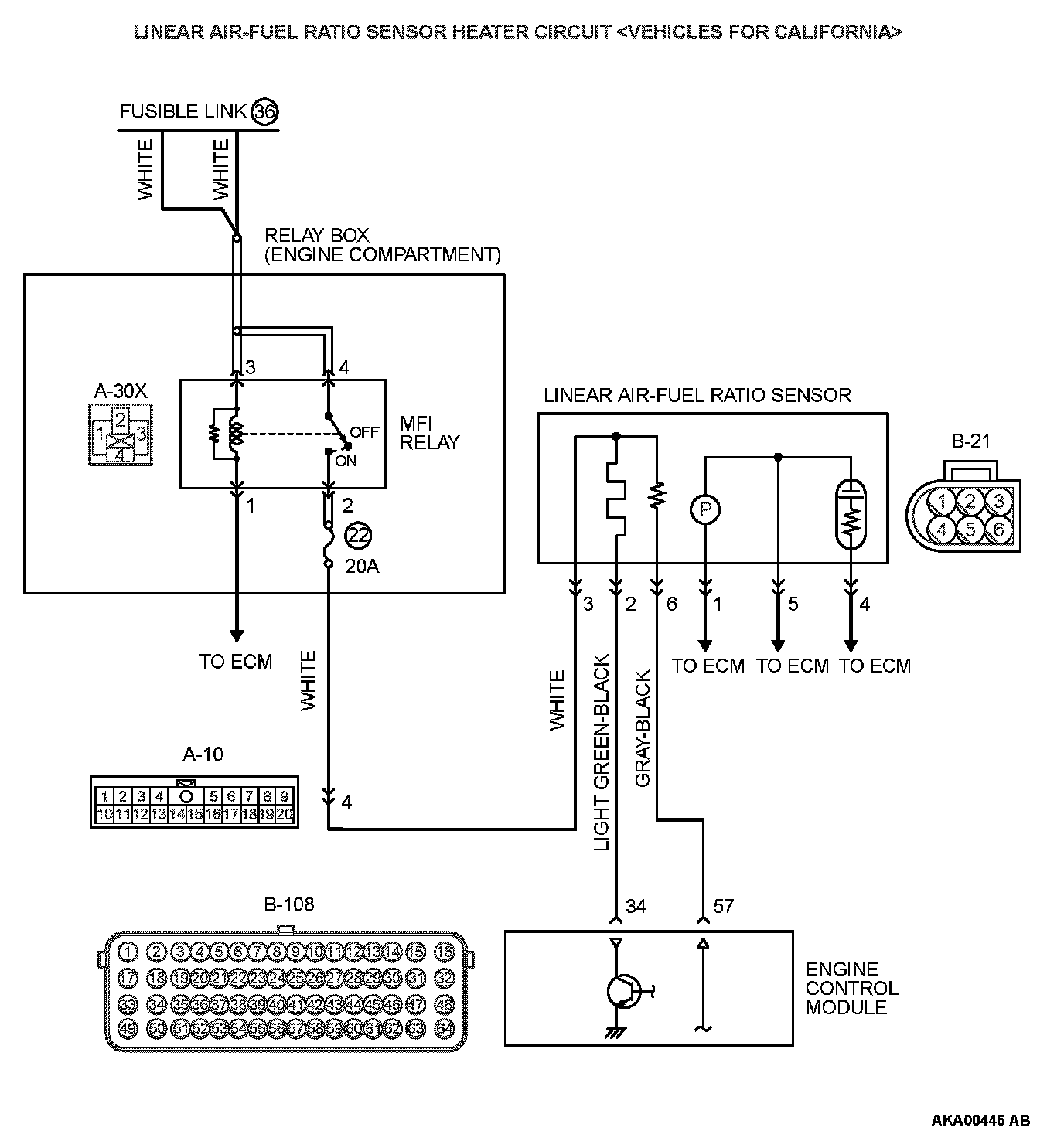 STEP 4. Check for harness damage between MFI relay connector A-30X (terminal No. 2) and linear air-fuel ratio sensor connector B-21 (terminal No. 3).