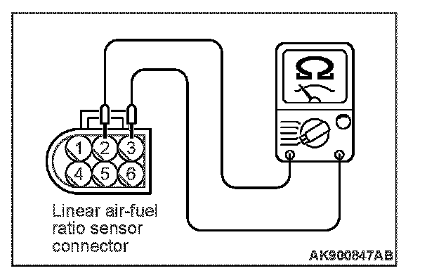 2. Measure the resistance between linear air-fuel ratio sensor connector terminal No. 2 and terminal No. 3.