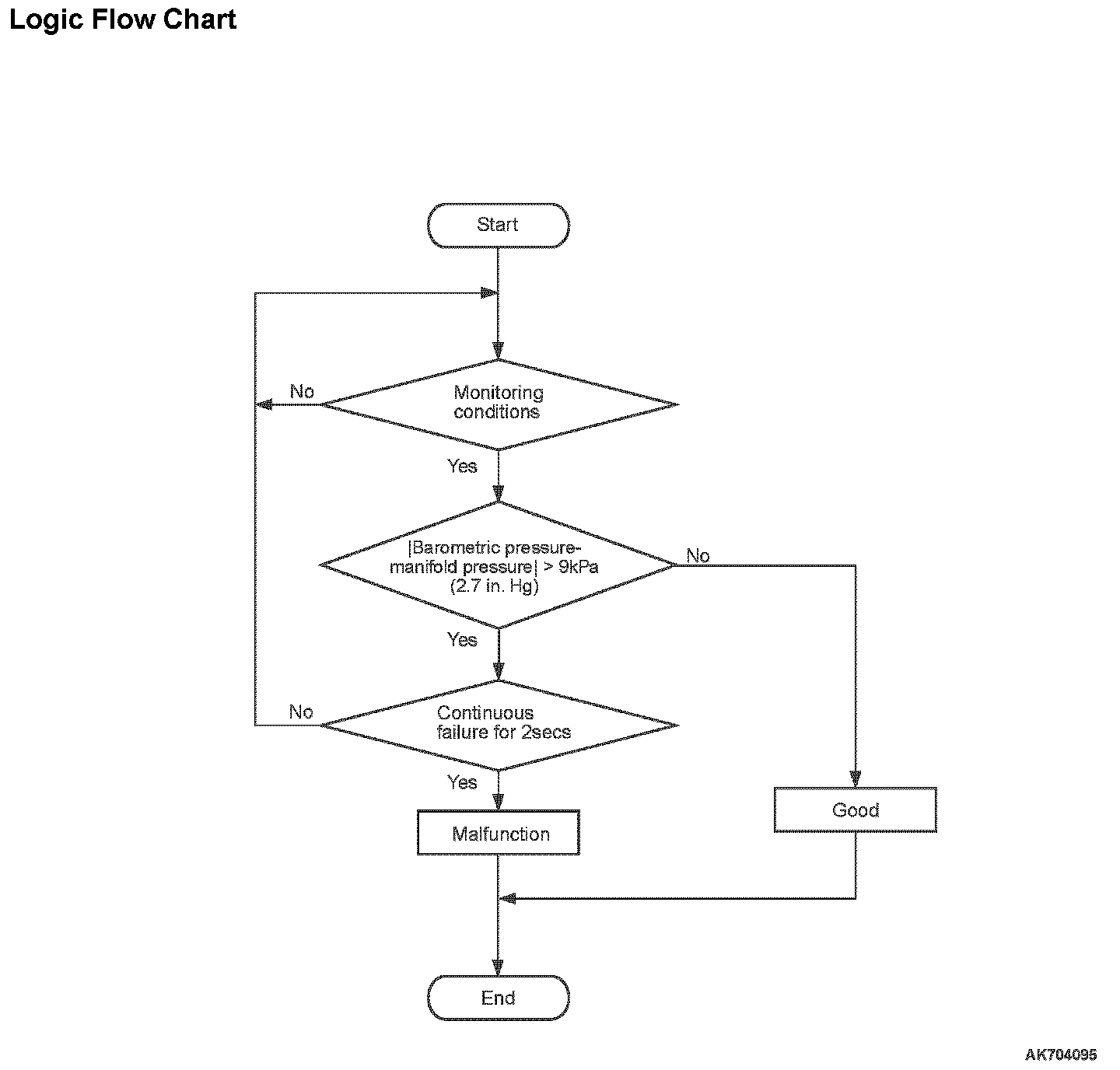 - Difference between barometric pressure sensor output and manifold absolute pressure sensor output is more than 9 kPa (2.7 in.Hg) for 2 seconds.
