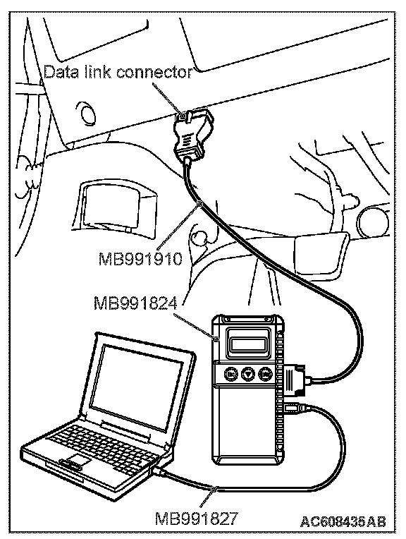 CAUTION: To prevent damage to scan tool MB991958, always turn the ignition switch to the "LOCK" (OFF) position before connecting or disconnecting scan tool MB991958.