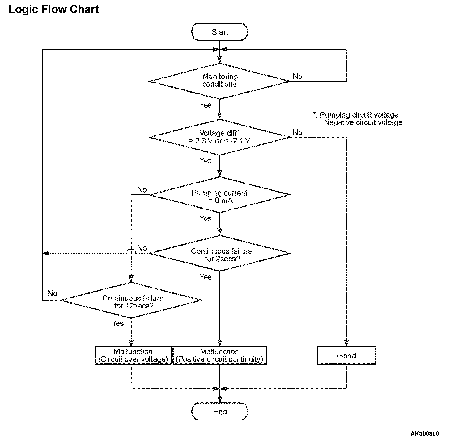 - The negative circuit voltage subtracted from the pumping circuit voltage is be lower than -2.1 volts or higher than 2.3 volts for 12 seconds.