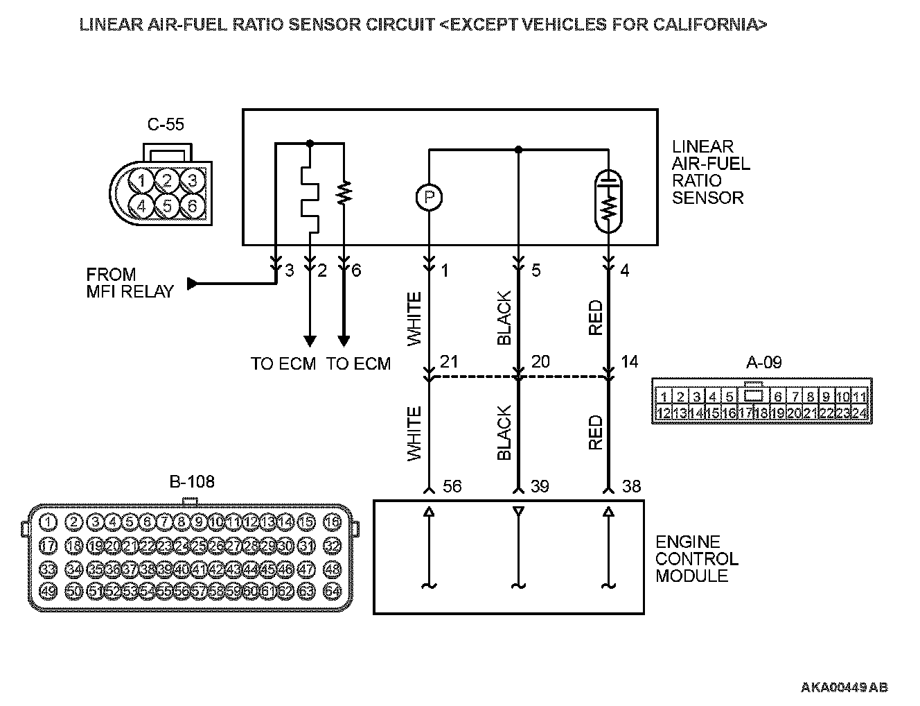 - The auxiliary line between the linear air-fuel ratio sensor (terminal No. 4) and the ECM (terminal No. 38) detects the air-fuel ratio.
