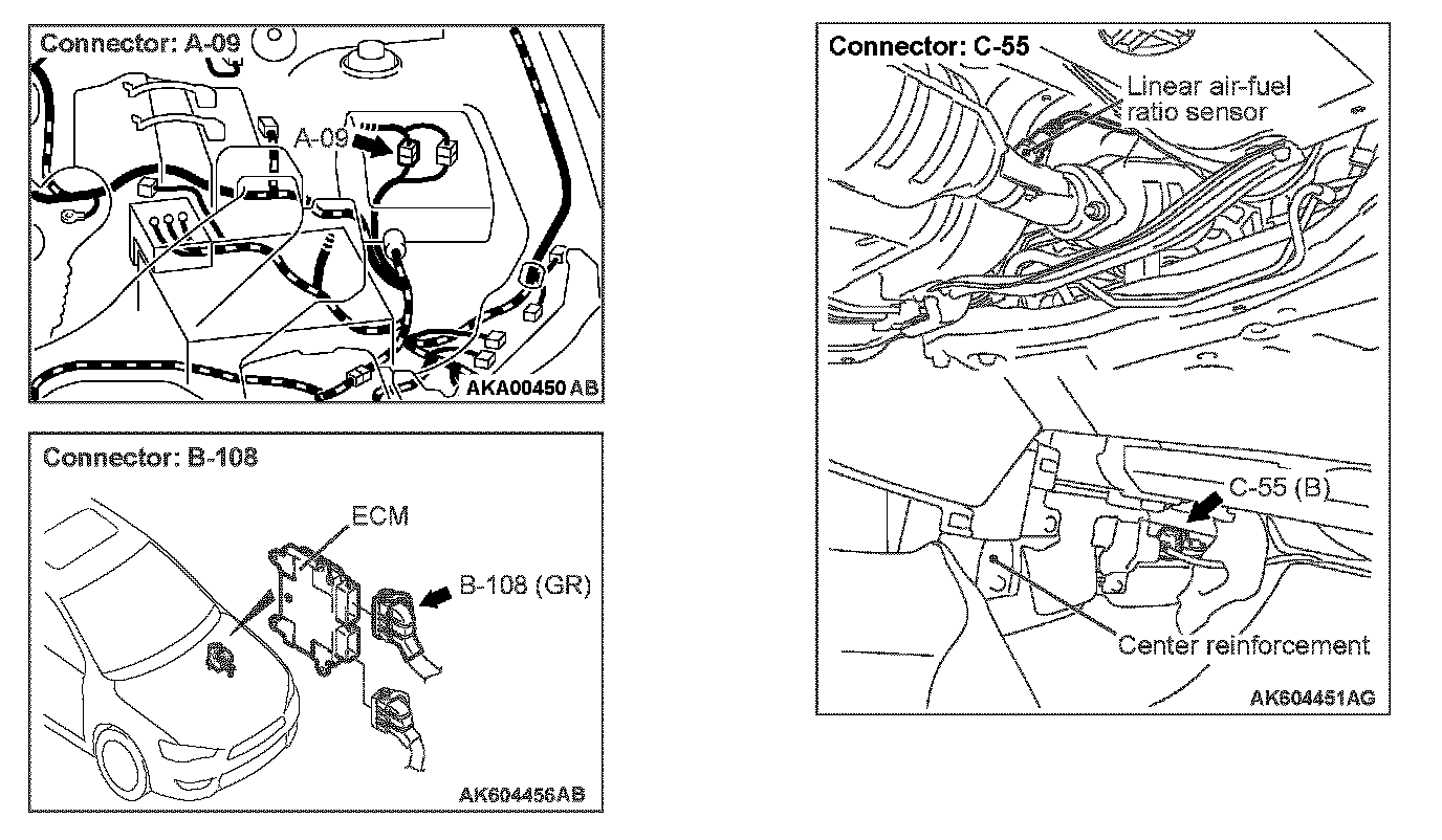 STEP 1. Check harness connector C-55 at linear air-fuel ratio sensor and harness connector B-108 at ECM for damage.