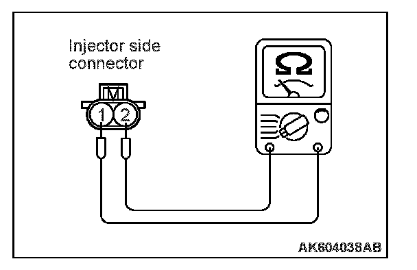 2. Measure the resistance between each injector side connector terminal No. 1 and No. 2.