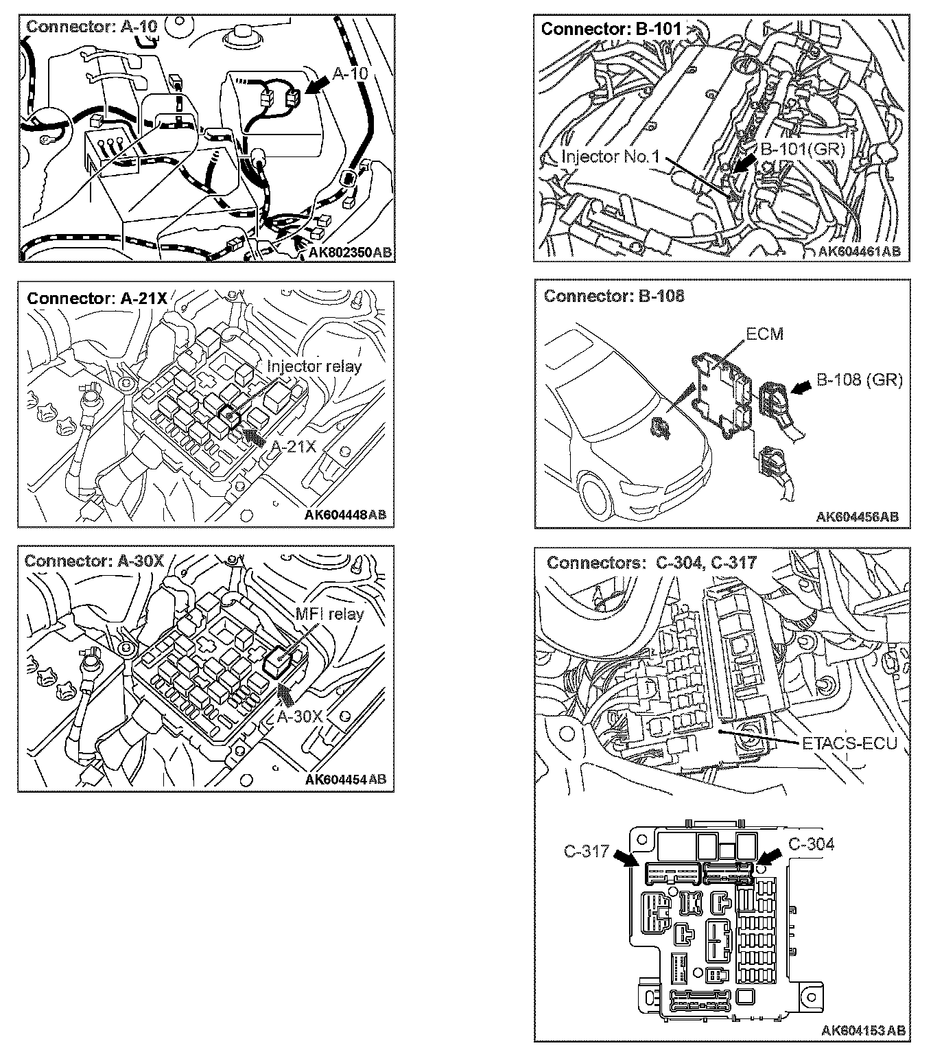 STEP 7. Check harness connector A-30X at MFI relay and harness connector A-21X at injector relay for damage.