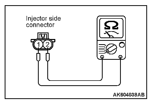 2. Measure the resistance between injector side connector terminal No. 1 and No. 2.