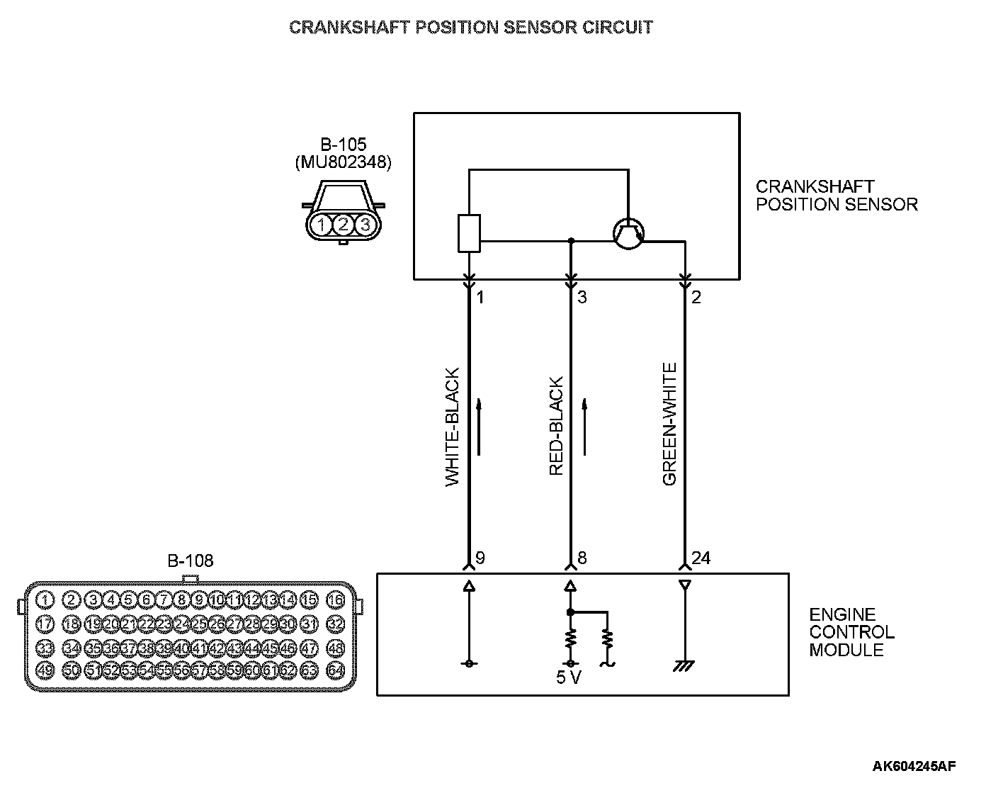 - A 5-volt voltage is applied on the crankshaft position sensor output terminal (terminal No. 3) from the ECM (terminal No. 8). The crankshaft position sensor generates a pulse signal when the output terminal is opened and grounded.