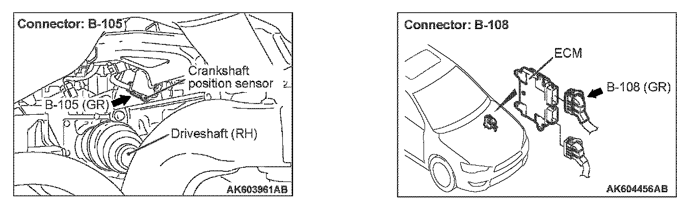 STEP 3. Check harness connector B-105 at crankshaft position sensor and harness connector B-108 at ECM for damage.