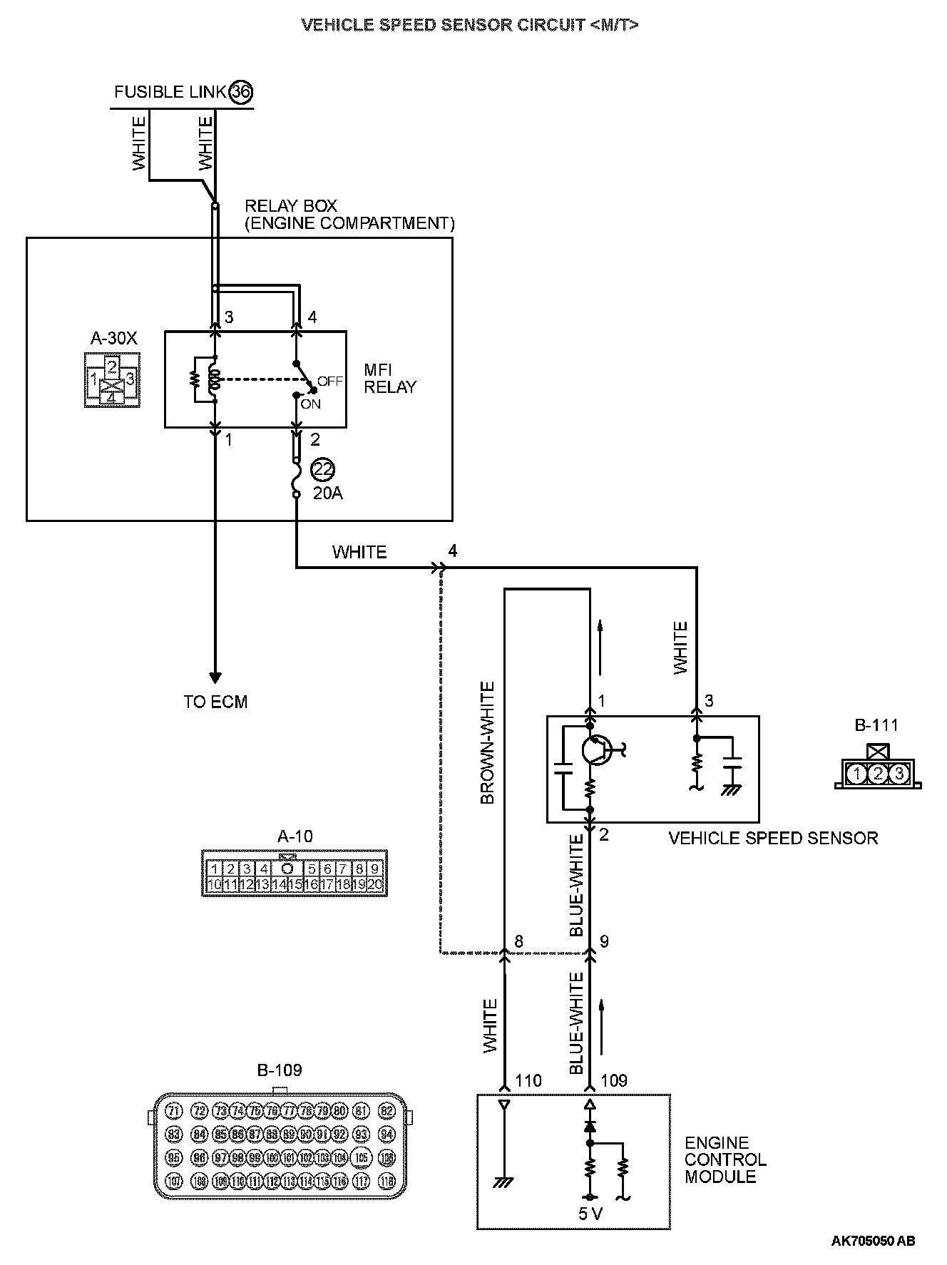 - A 5-volt voltage is applied to the vehicle speed sensor output terminal (terminal No. 2) from the ECM (terminal No. 109). The vehicle speed sensor generates a pulse signal when the output terminal is opened and grounded.