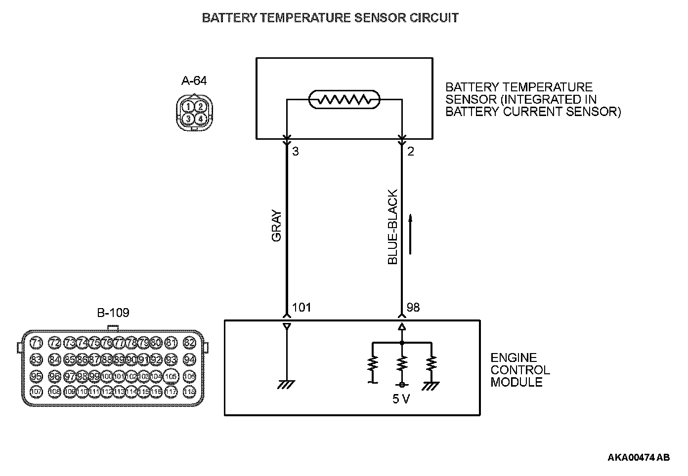 - Approximately 5 volts are applied to the battery temperature sensor output terminal (terminal No. 2) from the ECM (terminal No. 98) via the resistor in the ECM. The ground terminal (terminal No. 3) is grounded with ECM (terminal No. 101).