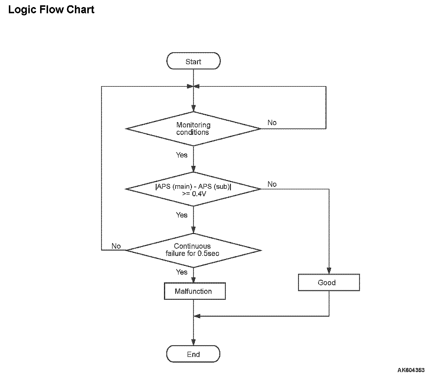 - The difference between the accelerator pedal position sensor (main) output voltage and the accelerator pedal position sensor (sub) output voltage is more than 0.4 volt for 0.5 second.