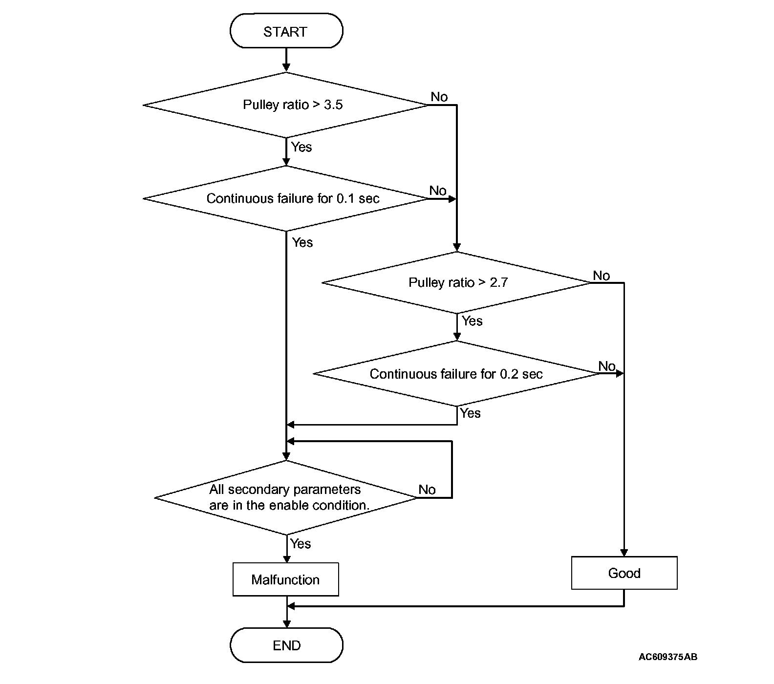 TCM determines that the malfunction is present when pulley ratio becomes higher (pulley ratio range: 2.349 to 0.394).