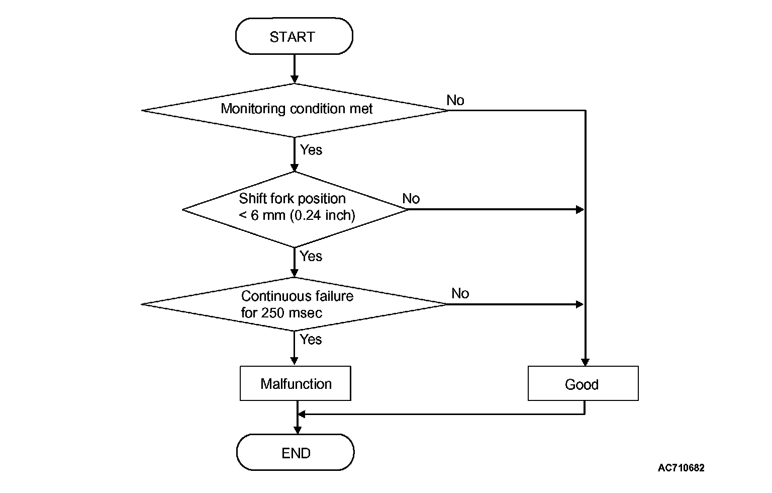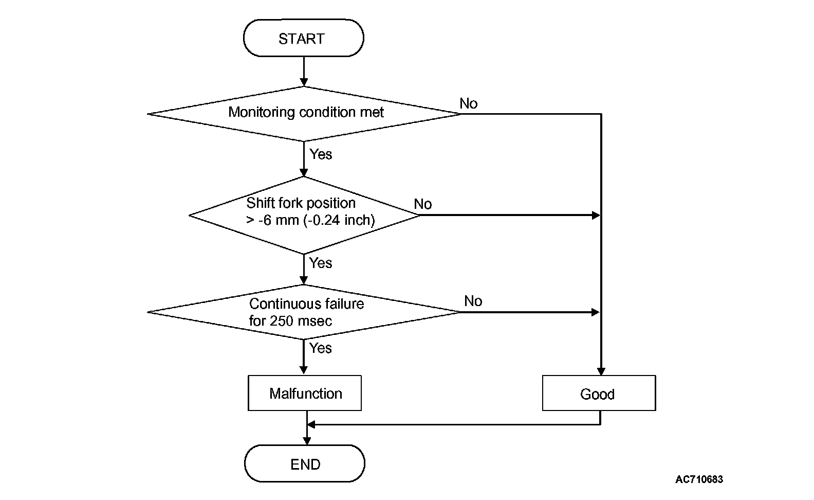 The travel distance of the shift fork 2 remains -6 mm (-0.24 inch) or less for 250 millisecond.