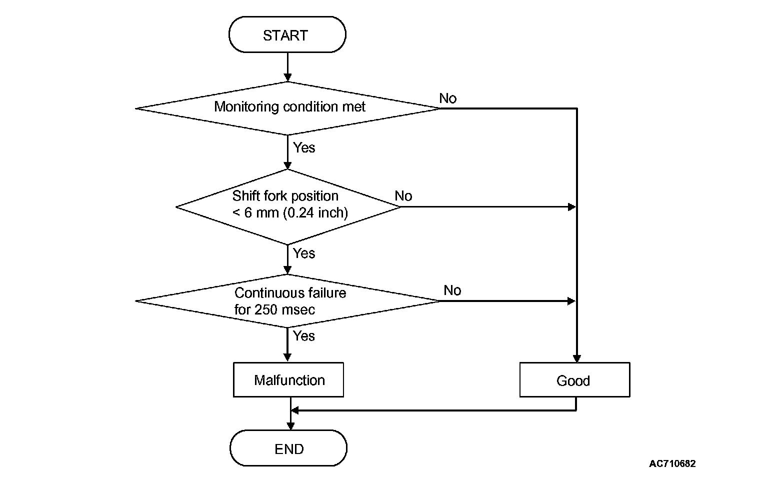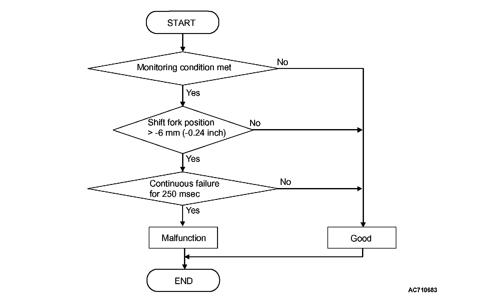 The travel distance of the shift fork 4 remains -6 mm (-0.24 inch) or less for 250 milliseconds.