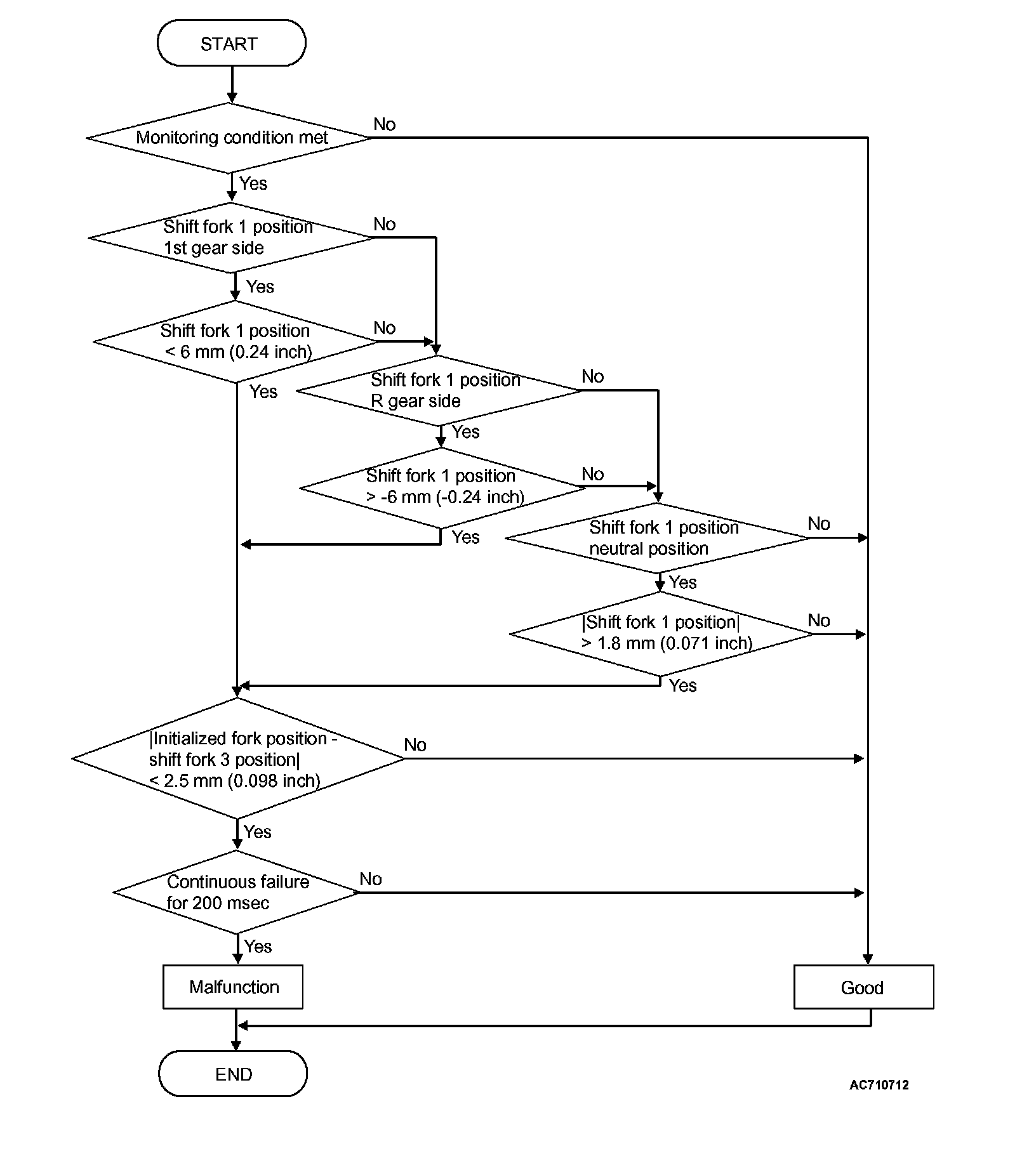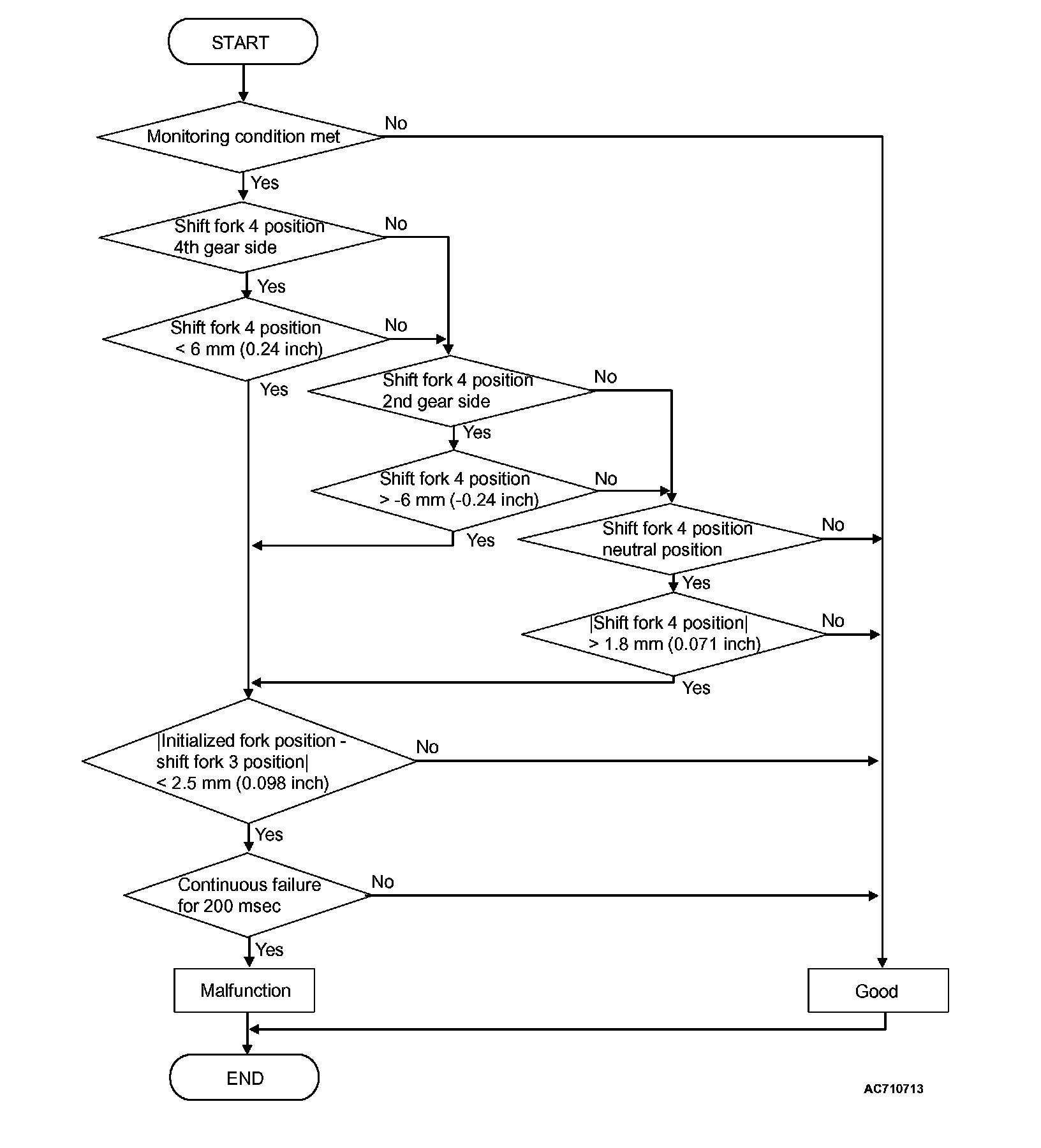 ^ Shift fork position: 6 mm (0.24 inch) [4th gear side] or less, or -6 mm (-0.24 inch) [2nd gear side] or more, or 1.8 mm (0.071 inch) [neutral position] or more, and initialized fork position - shift fork 3 position: 2.5 mm (0.098 inch) or less. (200 millisecond)