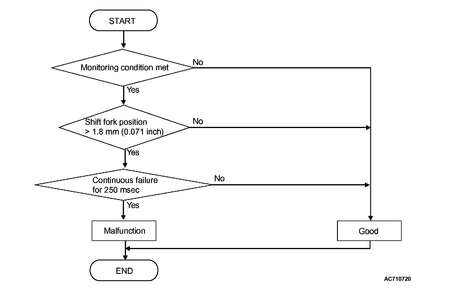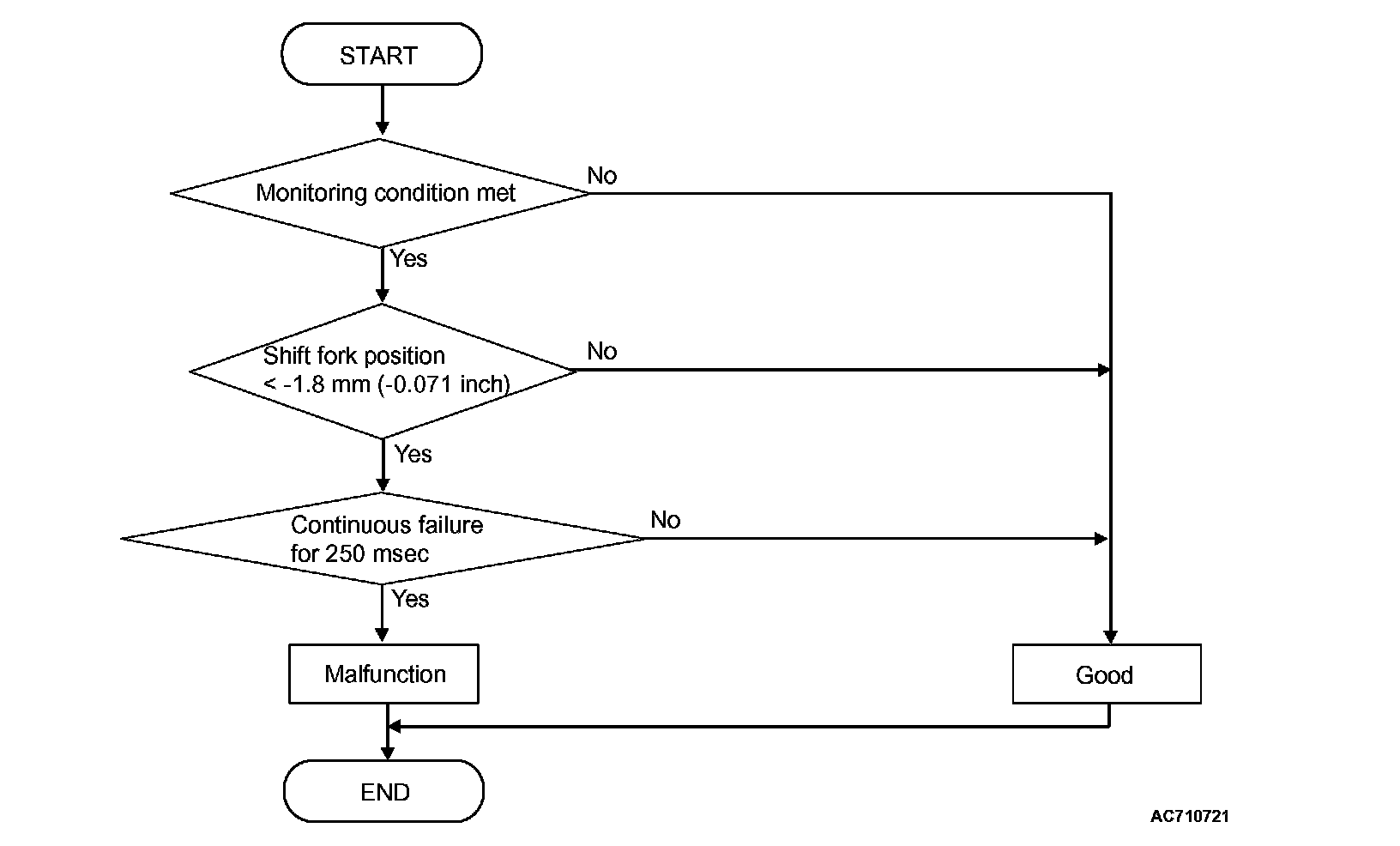 The shift fork 1 and 2 positions remain -1.8 mm (-0.071 inch) or more for 250 millisecond.