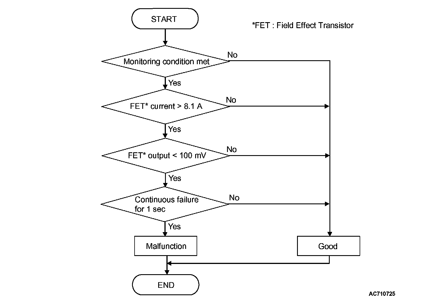 The status with the current of the FET channel shunt 8.1 A or less and with the FET channel output 100 mV or more continues for 1 second.