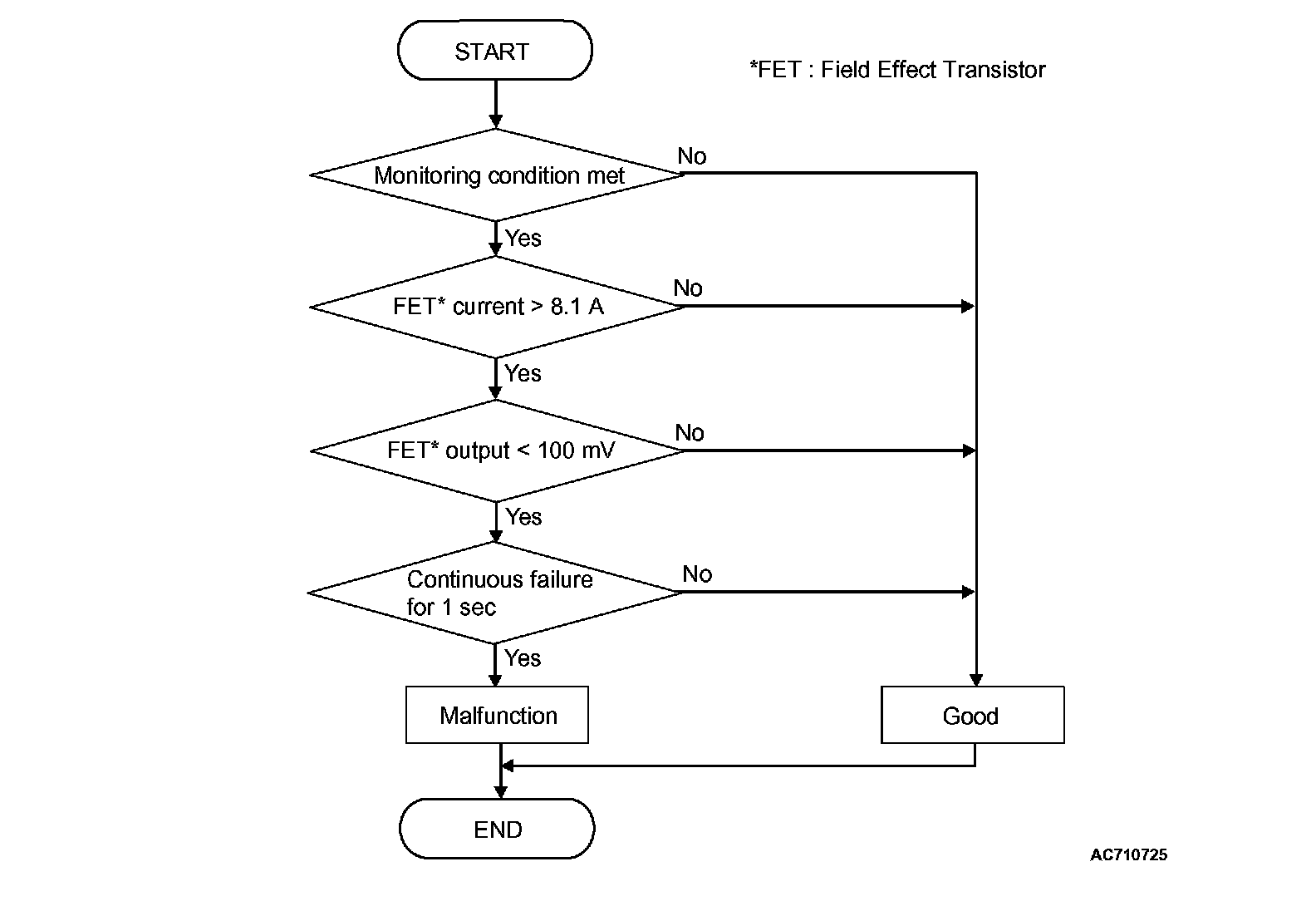The status with the current of the FET channel shunt 8.1 A or less and with the FET channel output 100 mV or more continues for 1 second.