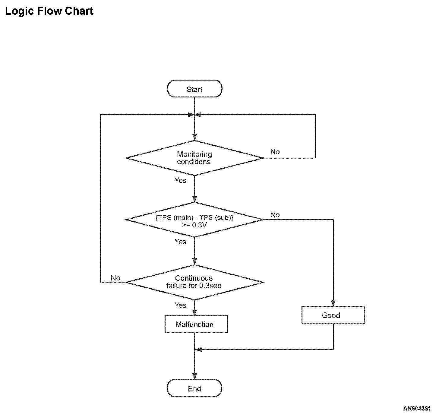 - ECM checks the throttle position sensor output signal characteristics for abnormal conditions.