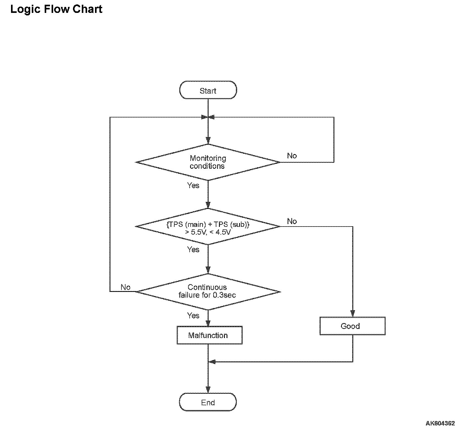 - For 0.3 second, the sum of the output voltage of the throttle position sensors (main) and (sub) is less than 4.5 volts, or more than 5.5 volts.
