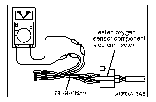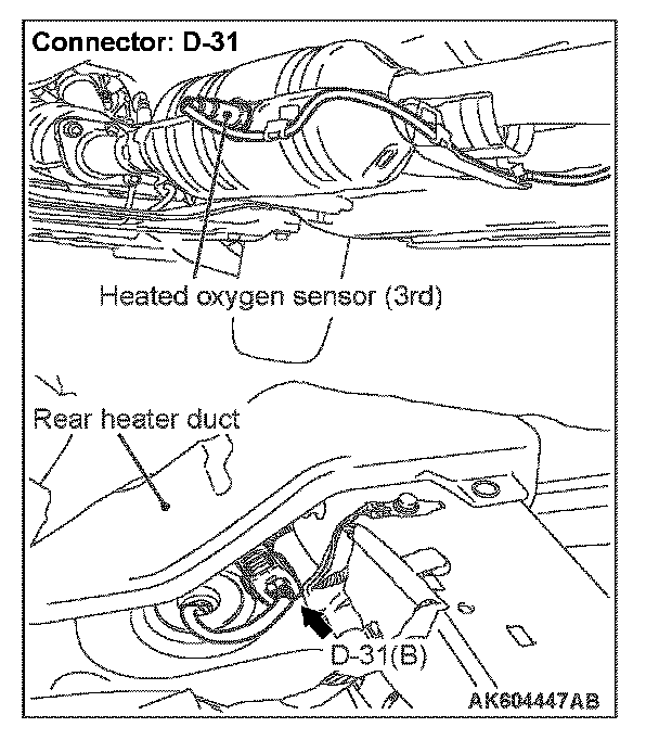 1. Disconnect the heated oxygen sensor (3rd) connector D-31 and connect test harness special tool MB991658 to the connector on the heated oxygen sensor (3rd) side.