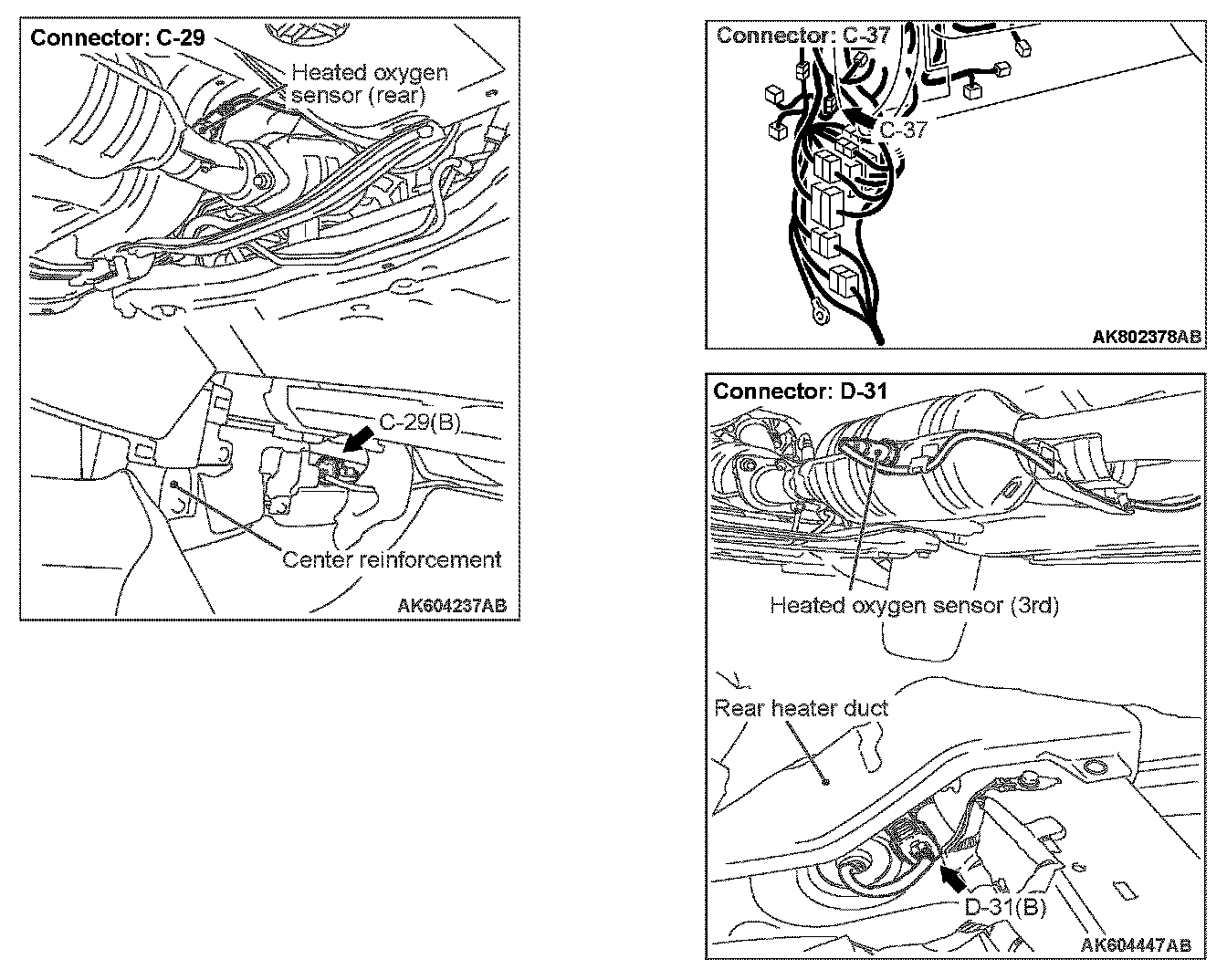 STEP 1. Check harness connector C-29 at heated oxygen sensor (rear) and D-31 at heated oxygen sensor (3rd) for damage.