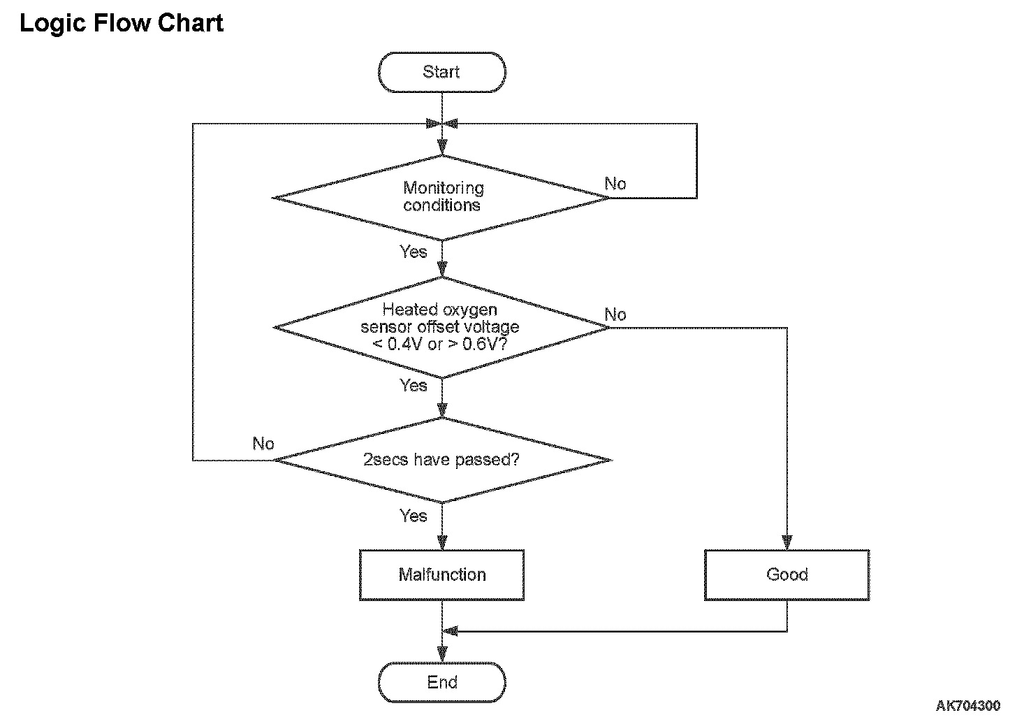 - Heated oxygen sensor offset voltage is more than 0.6 volt for 2 seconds.
