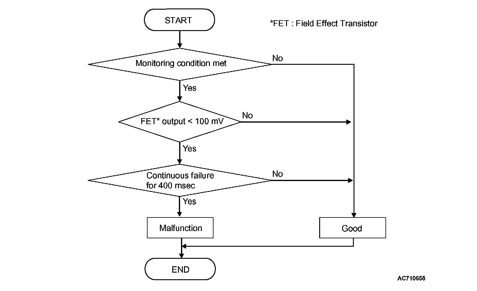 The FET channel output remains 100 mV or more for 400 milliseconds.