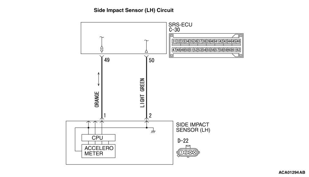 STEP 4. Check the harness wires for open circuit and short circuit between SRS-ECU connector C-30 (terminal No.49 and 50) and side impact sensor (LH) connector D-22 (terminal No.1 and 2).