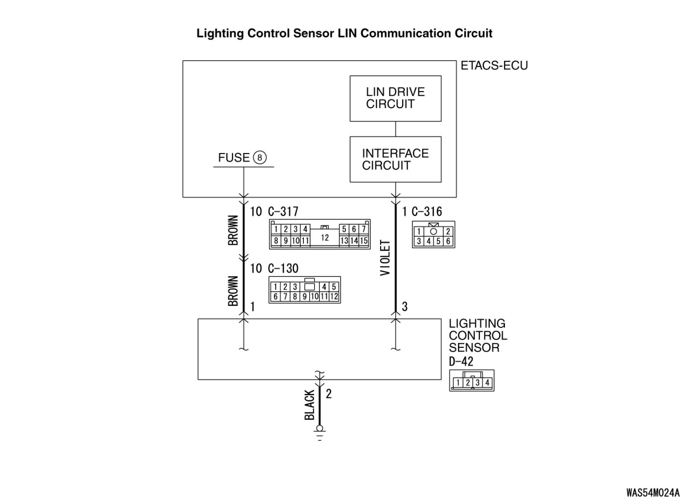 - Connector(s) or wiring harness in the LIN bus lines between the lighting control sensor and the ETACS-ECU, the power supply system of the lighting control sensor, or the lighting control sensor itself may be defective.