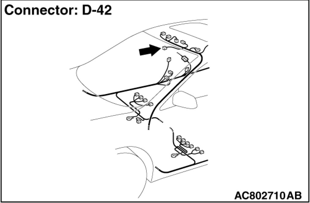 (1)Disconnect power window main switch connector D-42 and measure the resistance available at the wiring harness side of the connector.
