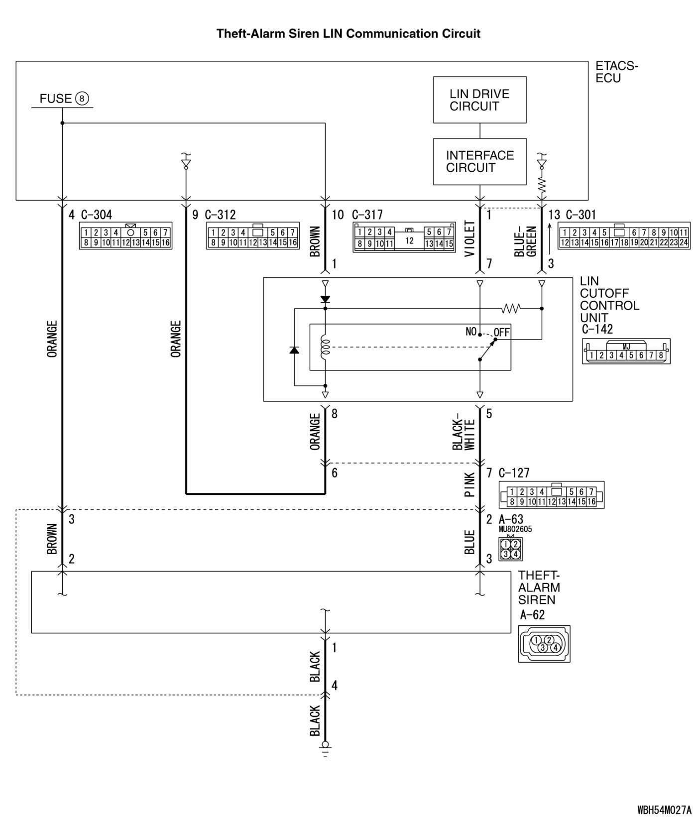 - Connector(s) or wiring harness in the LIN bus lines between the theft-alarm siren and the ETACS-ECU, the power supply system of the power window main switch, or the theft-alarm siren itself may be defective.