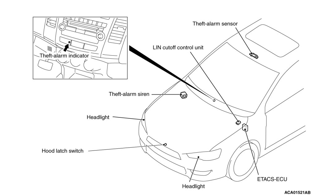 - The alarm for door/hood tampering and the alarm for vehicle invasion, jack-up, or power line cutoff to the ETACS-ECU/theft-alarm siren are established.