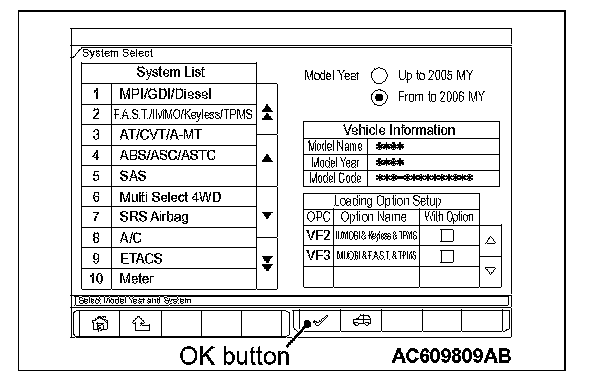 2. Select "F.A.S.T./IMMO/Keyless/TPMS" button from the "System Select" screen. Then, select the applicable option code item and push the OK button.