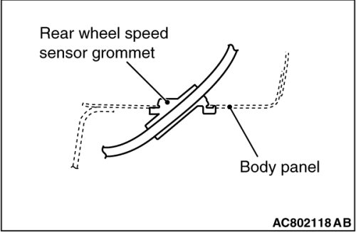 Install the rear wheel speed sensor grommet to the body panel snugly as shown in the figure.