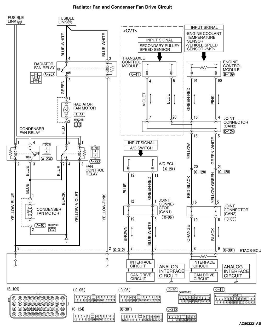 STEP 10. Check the harness wire between condenser fan relay connector A-23X terminal number 2 and ETACS-ECU connector C-312 terminal number 8, between radiator fan relay connector A-26X terminal number 1 and ETACS-ECU connector C-312 terminal number 2, and between fan control relay connector A-28X terminal number 3, for damage.