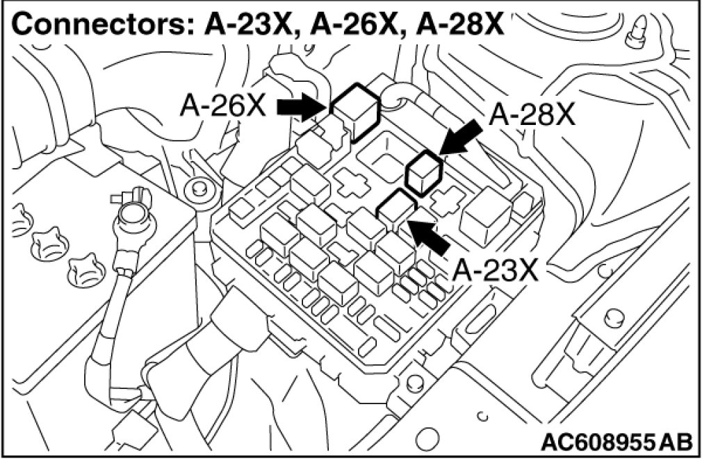 STEP 8. Check the condenser fan relay connector A-23X, radiator fan relay connector A-26X, fan control relay connector A-28X, and ETACS-ECU connector C-312, for loose, corroded or damaged terminals, or terminals pushed back in the connector.