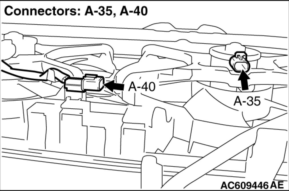 STEP 13. Check the condenser fan relay connector A-23X, radiator fan relay connector A-26X, fan control relay connector A-28X, radiator fan motor connector A-35, and condenser fan motor connector A-40, for loose, corroded or damaged terminals, or terminals pushed back in the connector.