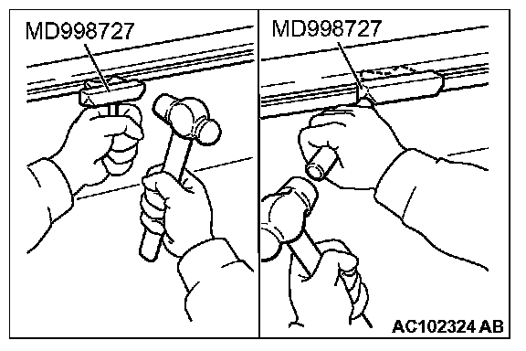 Do not forcibly drive in special tool MD998727 to avoid damage to the engine oil pan seal surface of cylinder block assembly.